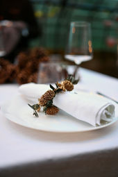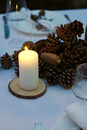 Designed for gatherings of 2 to 50 guests, this winter table concept blends crisp white linen, natural neutral tones, and warm seasonal details like pinecones and candlelight to create a serene, elevated tablescape. A delicate finishing touch ties it all together: matching napkin bows, perfectly coordinated with the centerpiece.
