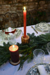 Designed for gatherings of 2 to 50 guests, this Christmas table concept blends evergreen pine, classic red and green tones, and the glow of red candlelight to create a timeless, joyful tablescape. A rich finishing detail completes the look: red velvet napkin bows, perfectly echoing the centerpiece for a cohesive and festive feel.